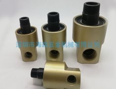 旋转接头与气动摩擦离合器冲床的齿轮轴(传动轴)相连,在双联阀供气后,压缩空气从旋转接头进入离合器,离合器带动齿轮轴(传动轴)旋转,而旋转接头只有与轴相连的部位旋转,主体部位不旋转的,其内部有轴承并且进行了端面密封,保证旋转时不漏气。